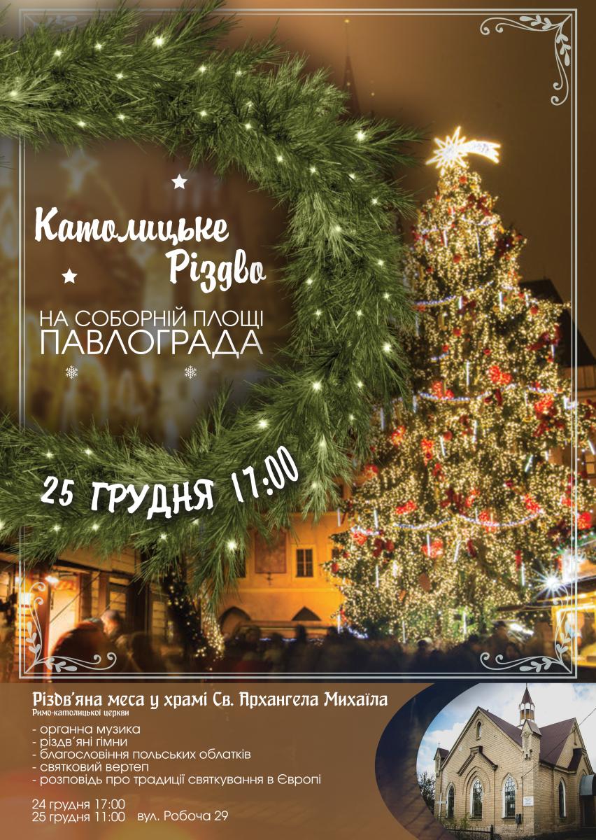 У Павлограді, вперше на Соборній площі, відсвяткують Різдво 25 грудня. Свято готує Римо-католицька громада і міський відділ культури. Початок програми о 17:00. Християнське свято Різдва Ісуса Христа павлоградці тепер зможуть відзначати не тільки за Юліанським календарем, а й за Григоріанським – як і всі жителі західних країн. Для городян в цьому році підготували культурно-дозвільницьку програму.